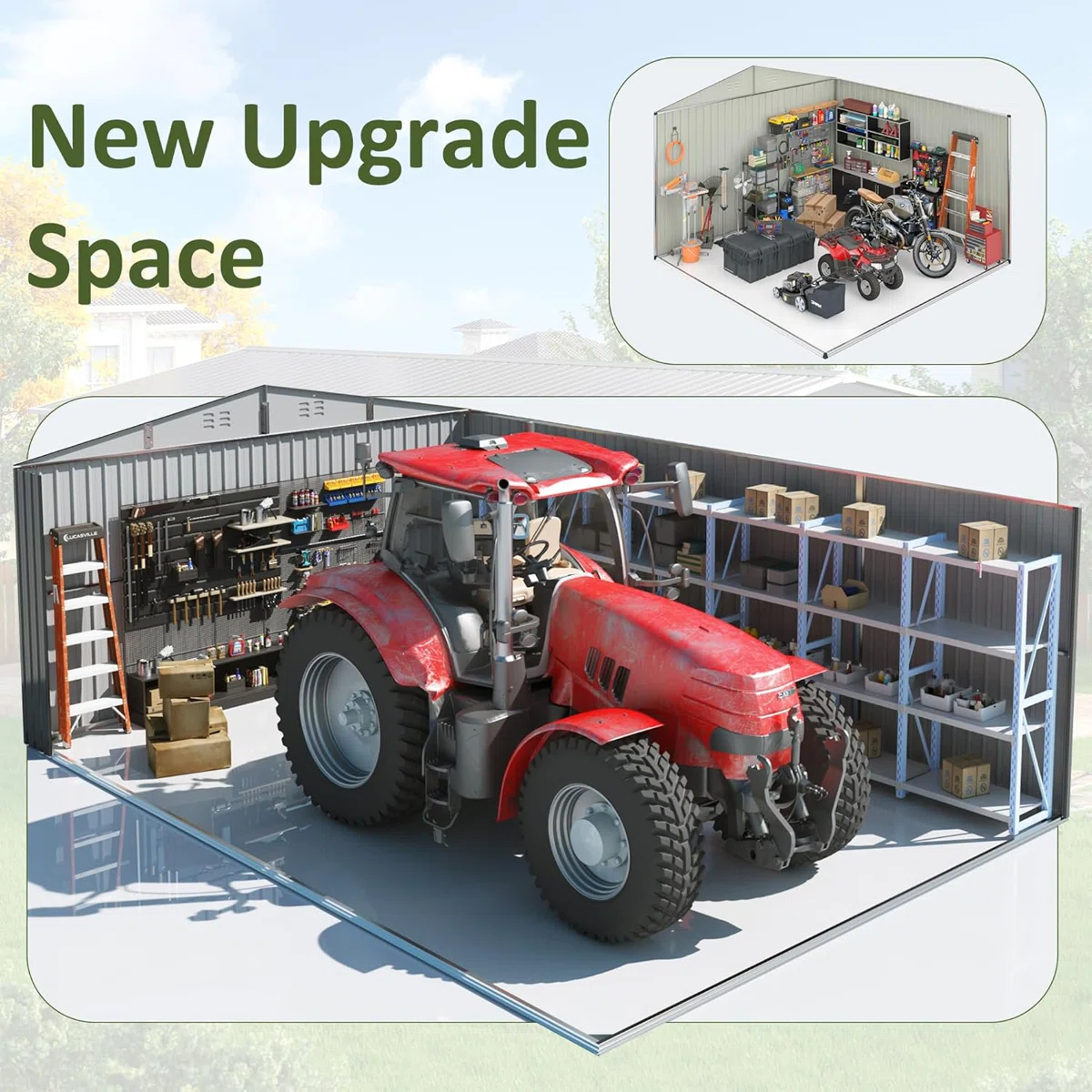 Designed to accommodate large equipment, outdoor furniture, bicycles, and storage containers.