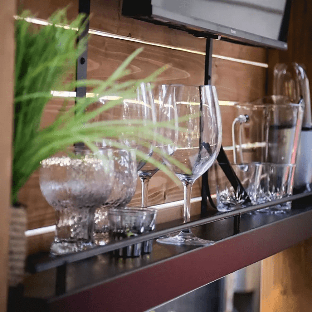 - Steel bar top & shelving – sleek, modern, and easy to maintain.