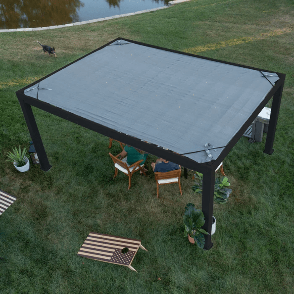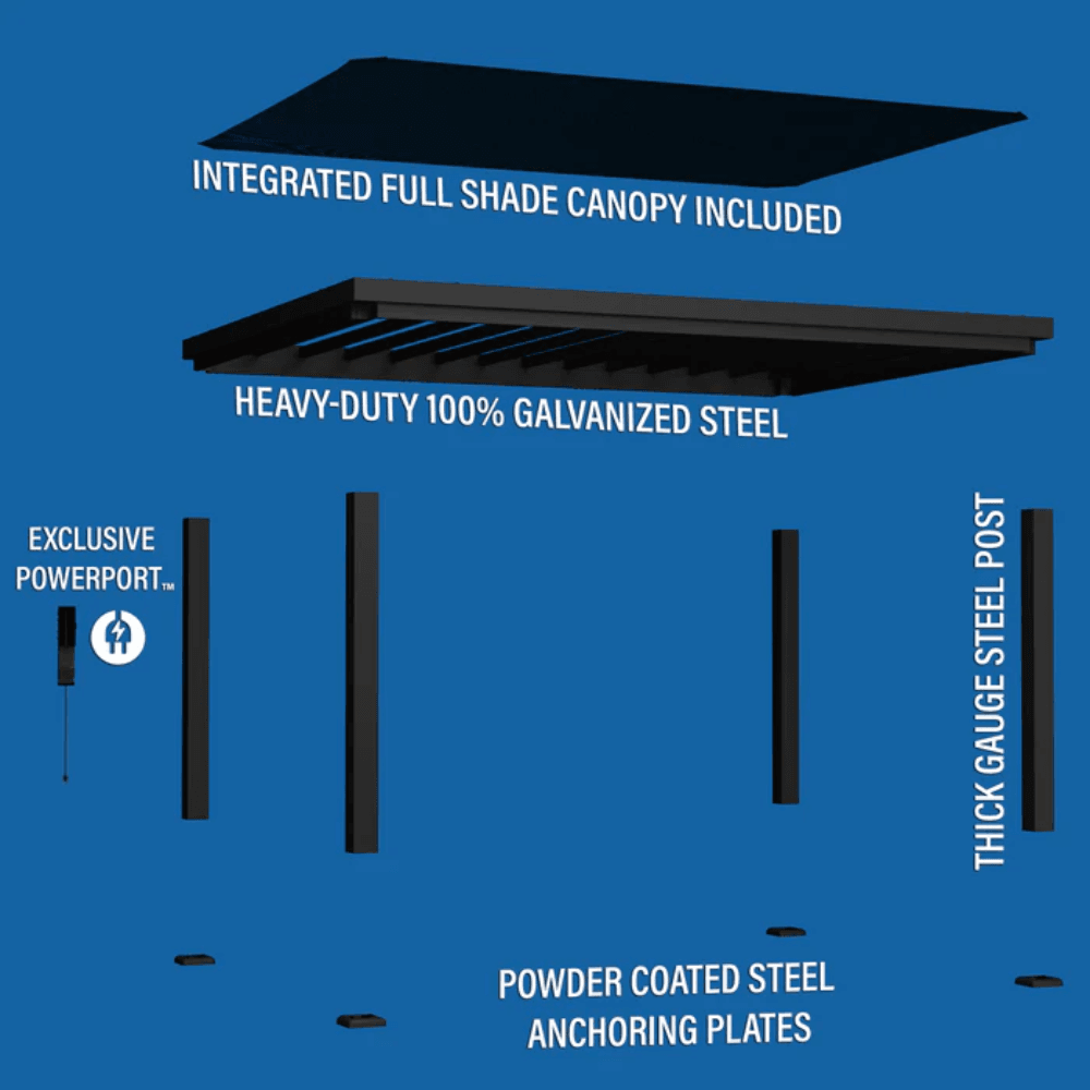 Featuring a sleek modern black finish, an integrated PowerPort™, and a breathable UV-protected soft shade sail canopy, it offers a perfect blend of durability, elegance, and year-round usability.
