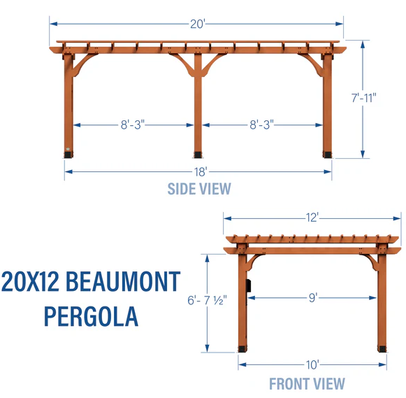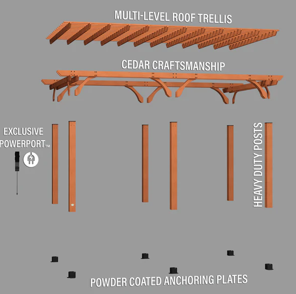 Enhance your backyard with the stunning Beaumont Pergola, where traditional design meets superior engineering. Constructed from 100% cedar wood, it exudes natural charm while providing lasting resistance against decay. From dinner parties to quiet morning coffee, the versatile design creates endless possibilities for your outdoor living space. Thoughtfully crafted with dual structural cross beams, robust support posts, and elegant corbels, this patio pergola delivers exceptional strength and enduring beauty. It’s Pro-Tect tested and proven to withstand winds of up to 100 mph* and includes thick, powder-coated steel anchoring plates, ensuring stability in the most extreme weather conditions. Our patented PowerPort features three USB ports and three electrical outlets to power a wide range of devices, lighting, and accessories. The trellis roof adds a beautiful classic aesthetic and is perfect for hanging potted plants or climbing vines. It also allows sunlight to filter through, creating a pleasant blend of light and shade that’s ideal for outdoor seating areas, patios, and gardens. This wooden pergola kit is ready to assemble with pre-cut, pre-drilled, and pre-stained components, while the interactive BILT app provides guided instructions so you can build your backyard sanctuary with less hassle. Elevate your outdoor lifestyle with the Beaumont Pergola.