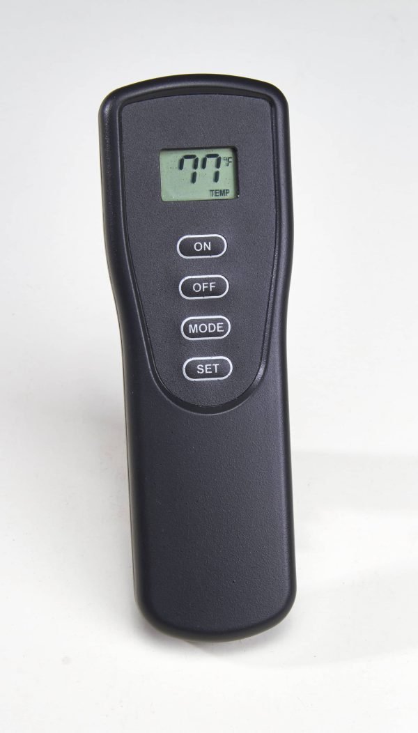 - LCD remote screen displays: Room Temp (°F or °C), Burner On/Off status, and Mode