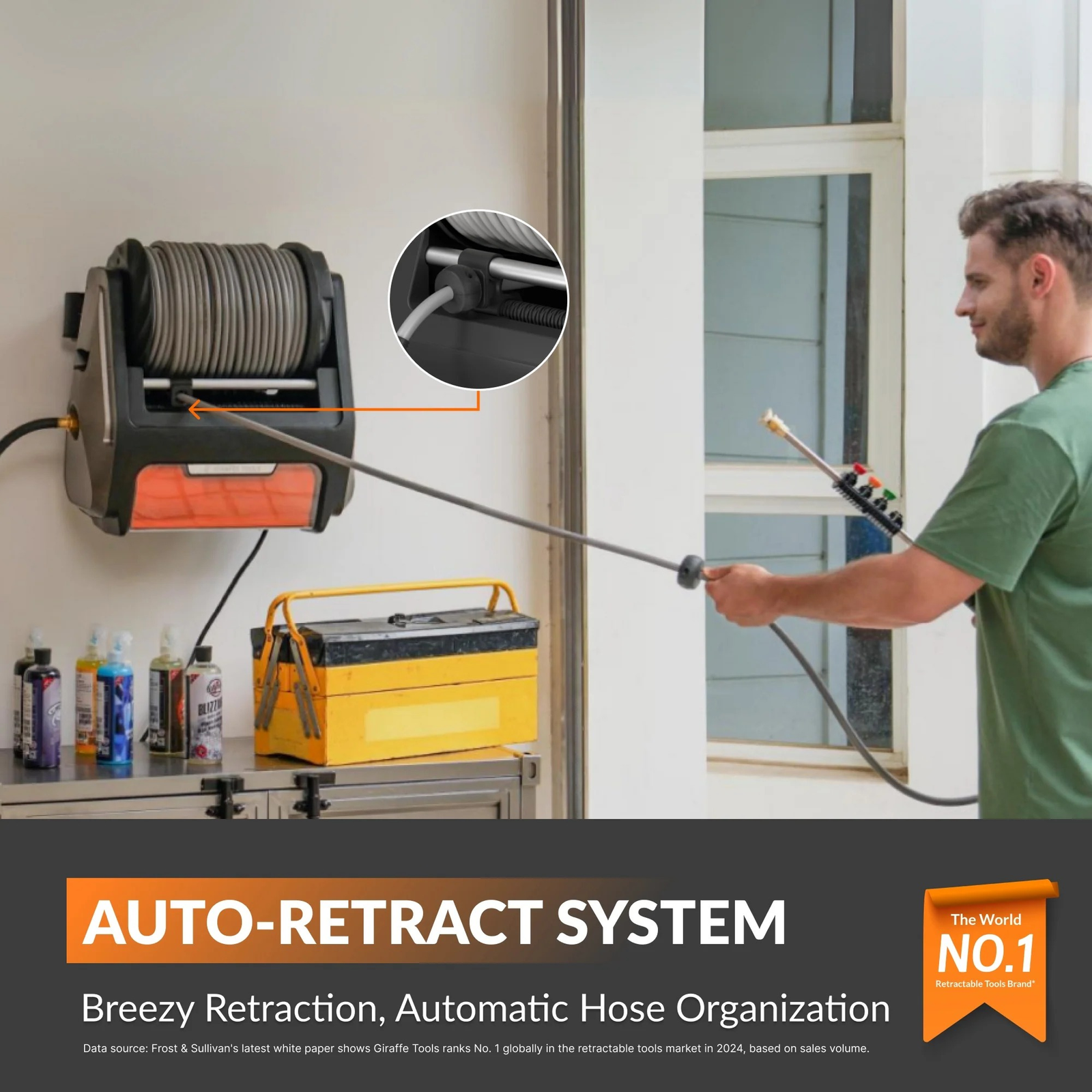 The auto-retract hose system adds a new level of convenience by eliminating manual winding and helping keep the hose