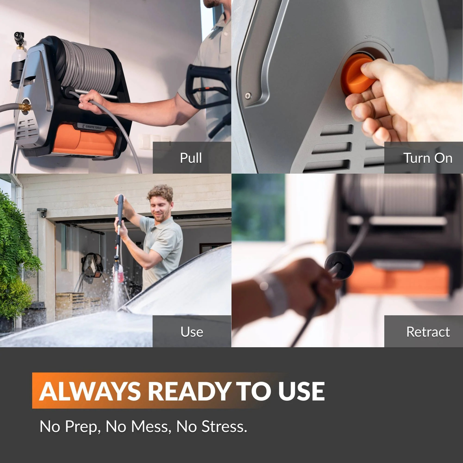 - Auto-retract system for easy, tangle-free hose management