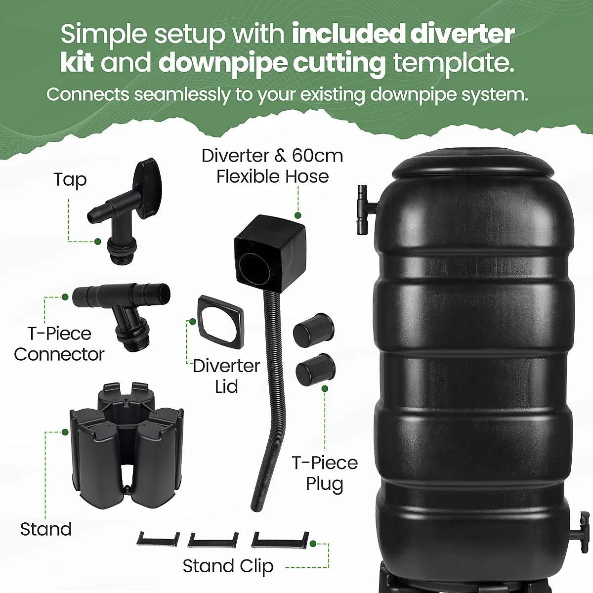 - Comes with Water Butt, Stand, Lid, Tap and Rainwater Downpipe Diverter Kit (with flexible pipe).