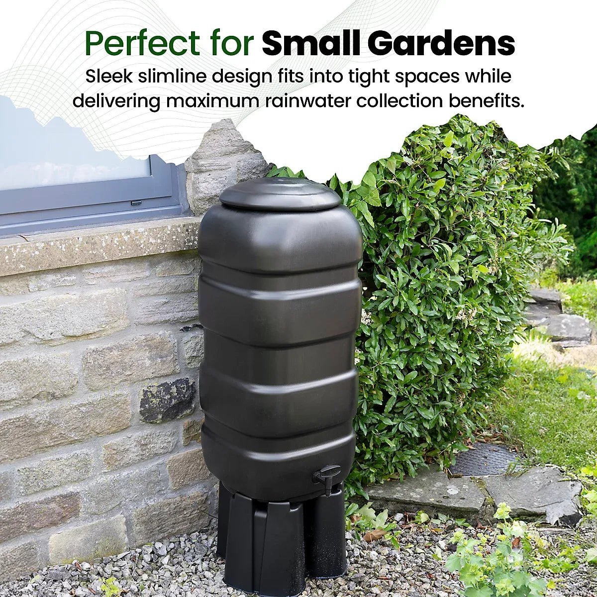 - Slim profile water butt for garden & decking.