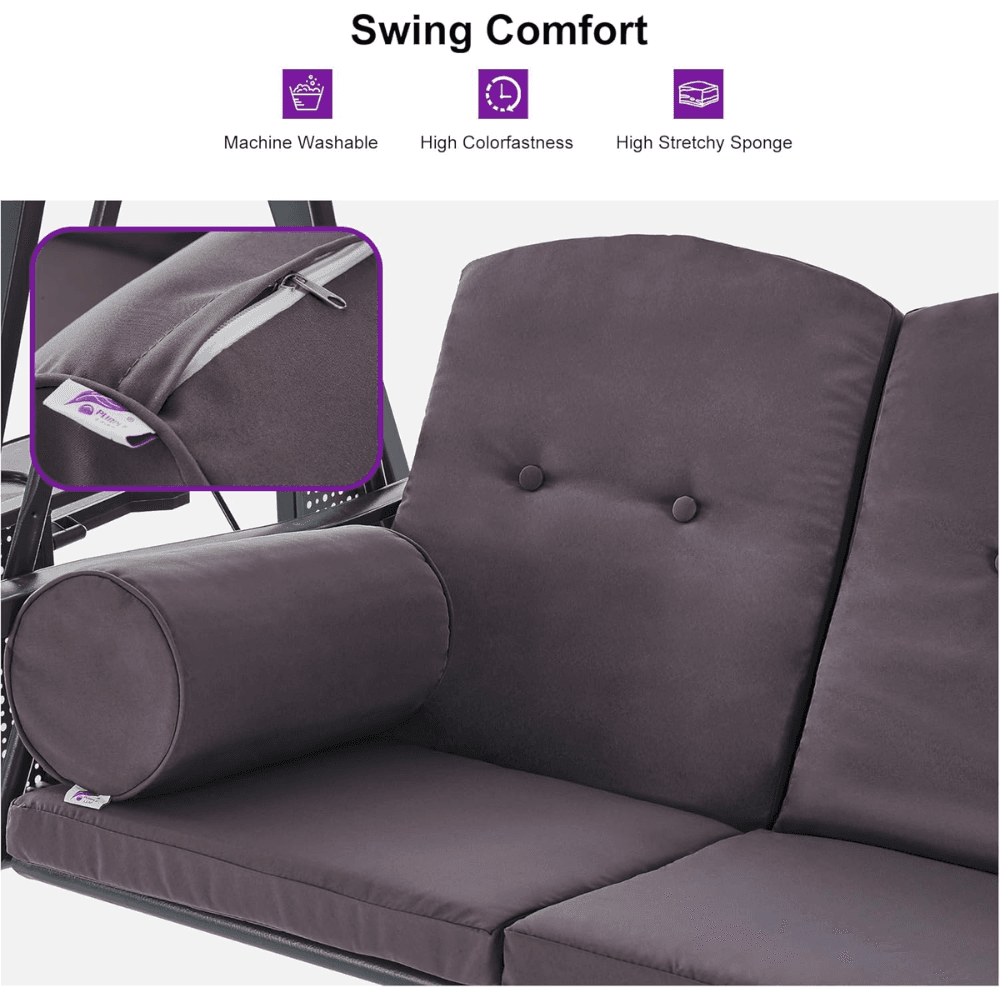 PURPLE LEAF 3-seat Outdoor Patio Porch Swing Adjustable Backrest, Cushions and Pillow Included