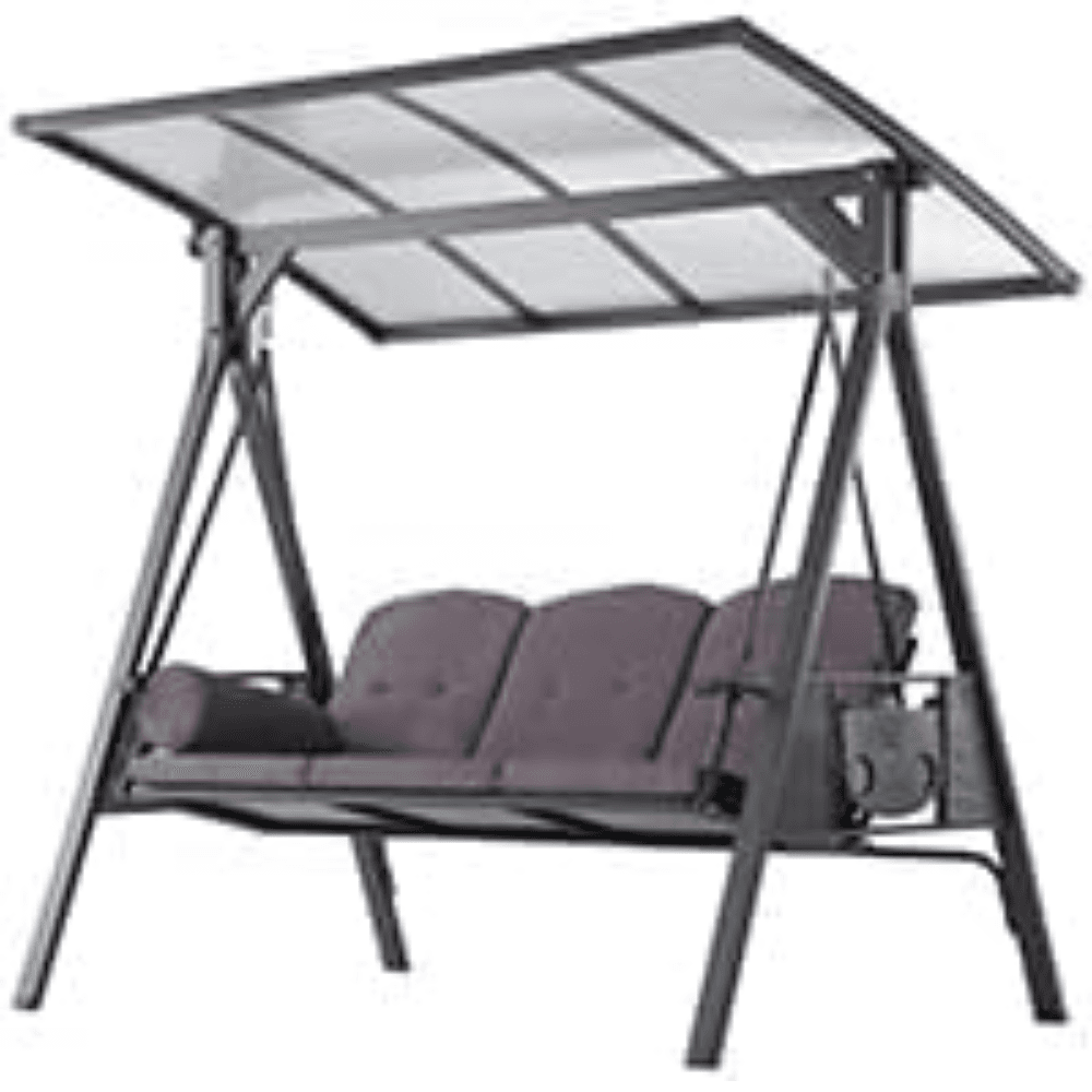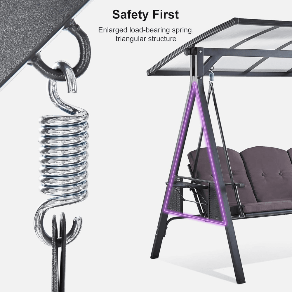 Upgrade your outdoor relaxation experience with the PURPLE LEAF Outdoor Swing, designed for ultimate comfort, durability, and convenience. Featuring a sturdy powder-coated steel frame, a UV-resistant adjustable hardtop canopy, and built-in side tables, this three-seat swing is perfect for porches, patios, gardens, and backyards.