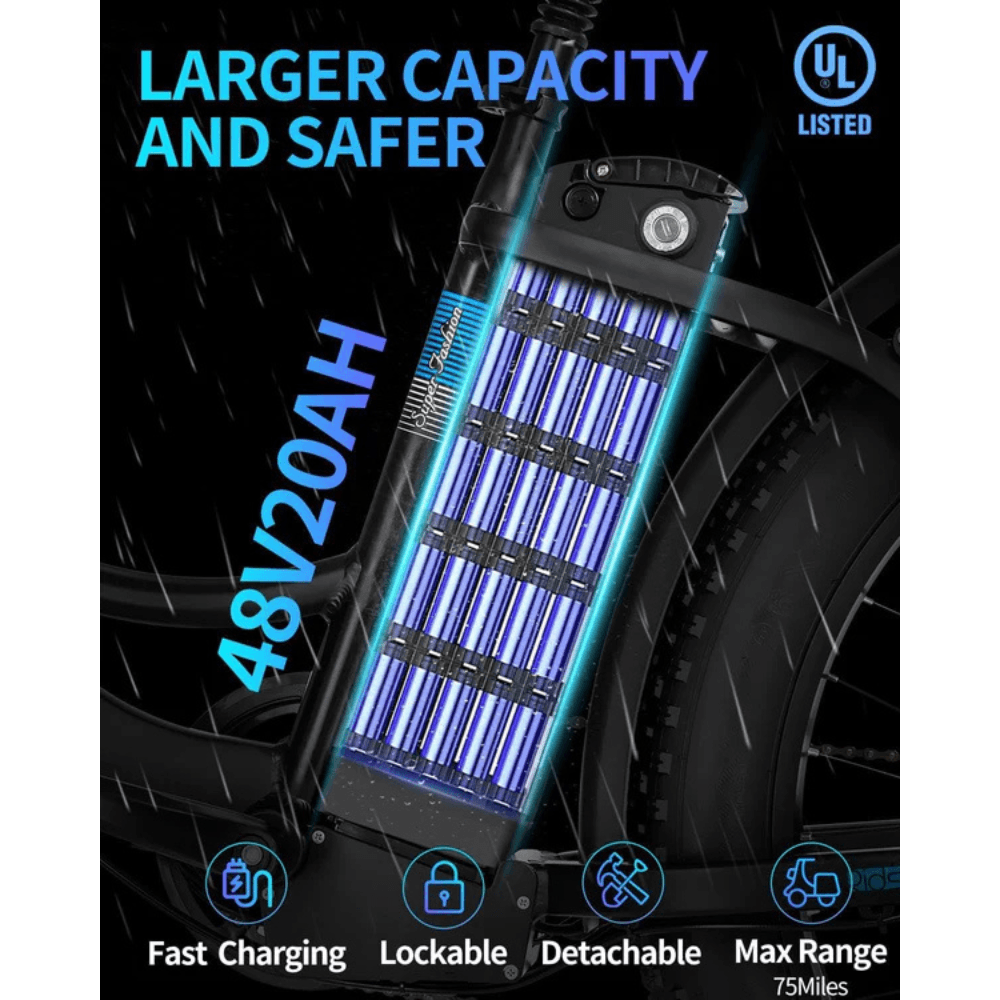 • Fat Tire Stability: Durable fat tires provide superior grip and stability on a variety of surfaces, from rocky mountain paths to urban pavements.