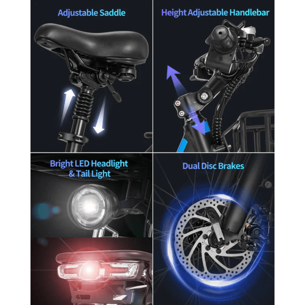 • Enhanced Lighting: Front and rear LED lights offer excellent visibility during night rides, while integrated safety features add peace of mind.