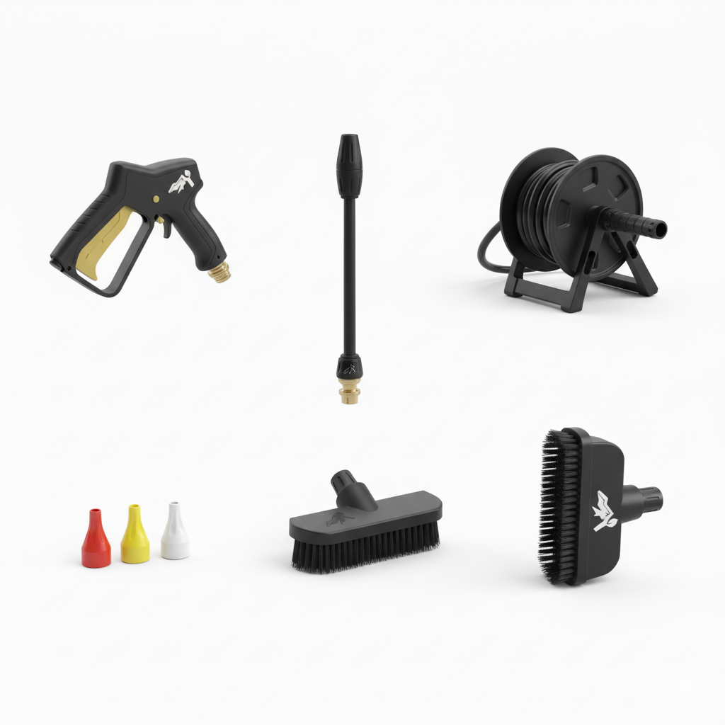 - Set of spray nozzles (e.g., adjustable/fan, turbo, detergent)