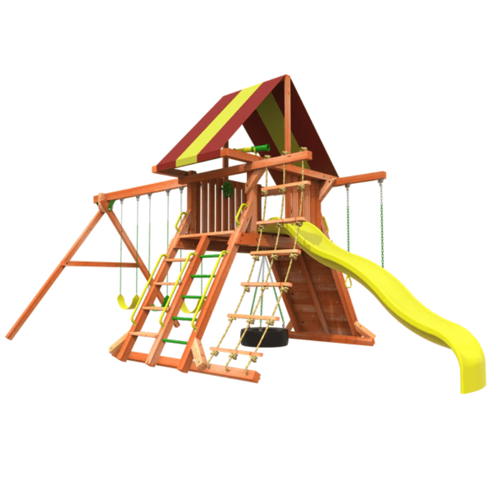 Swing set with slide, monkey bars, rock wall, and play deck for endless adventure.